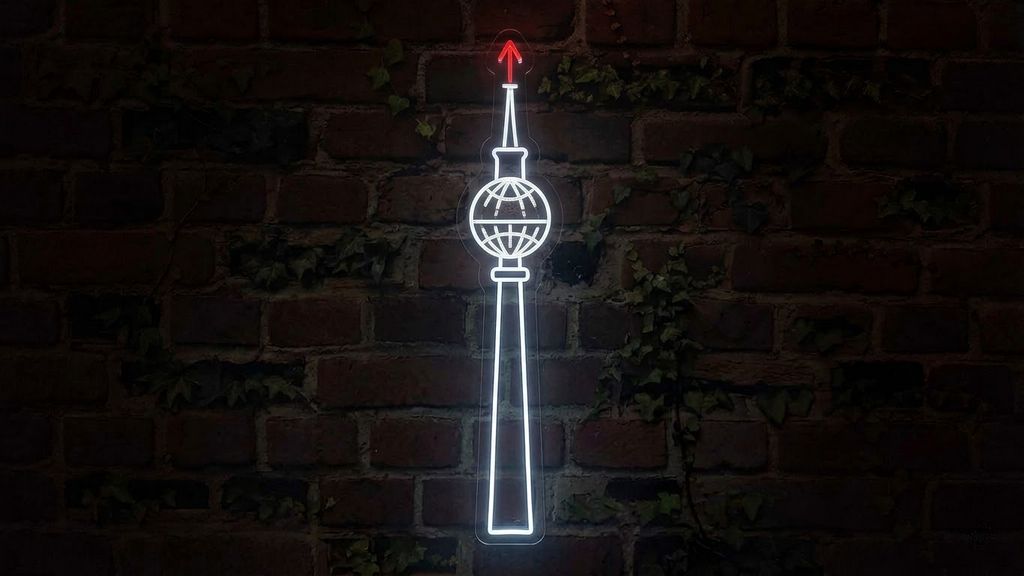 Alle unsere LED Neonschilder werden in Handarbeit aus flexiblen LED-Streifen gefertigt, die über 50.000 Stunden leuchten und dabei energieeffizient sind. Die Montage an der Wand gelingt in wenigen Minuten dank der mitgelieferten Abstandshalter. Wählen Sie aus einer breiten Farbpalette — von warmem Weiß über intensives Pink bis zur RGB-Variante mit Fernbedienung — Neon Schriftzug personalisiert, LED Schild eigenes Logo, neonschilder personalisiert. Der Berliner Fernsehturm als Neon Schild ist ein handgefertigtes Unikat von unserem Neonschilder Hersteller — bestellen Sie Ihr personalisiertes Leuchtschild auf omineo.com!